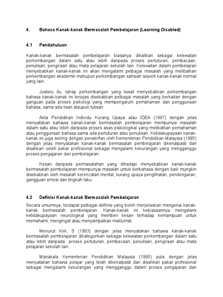 Mendefinisikan masalah pembelajaran sebagai kelewatan perkembangan dalam satu atau lebih daripada proses pertuturan, pembacaan, penulisan, pengiraan atau mata pelajaran sekolah yang lain. Pengesanan awal masalah pendengaran adalah sangat penting. Hal ini berarti bahwa anak telah dapat mengungkapkan keinginananya, penolakannya, maupun pendapatnya dengan menggunakan bahasa lisan. Mereka perlu persekitaran yang sihat, selamat dan muhibbah. Tahap perkembangan bahasa berbicara anak secara umum perkembangan bahasa terbagi bicara merupakan salah satu alat komunikasi yang paling efektif.